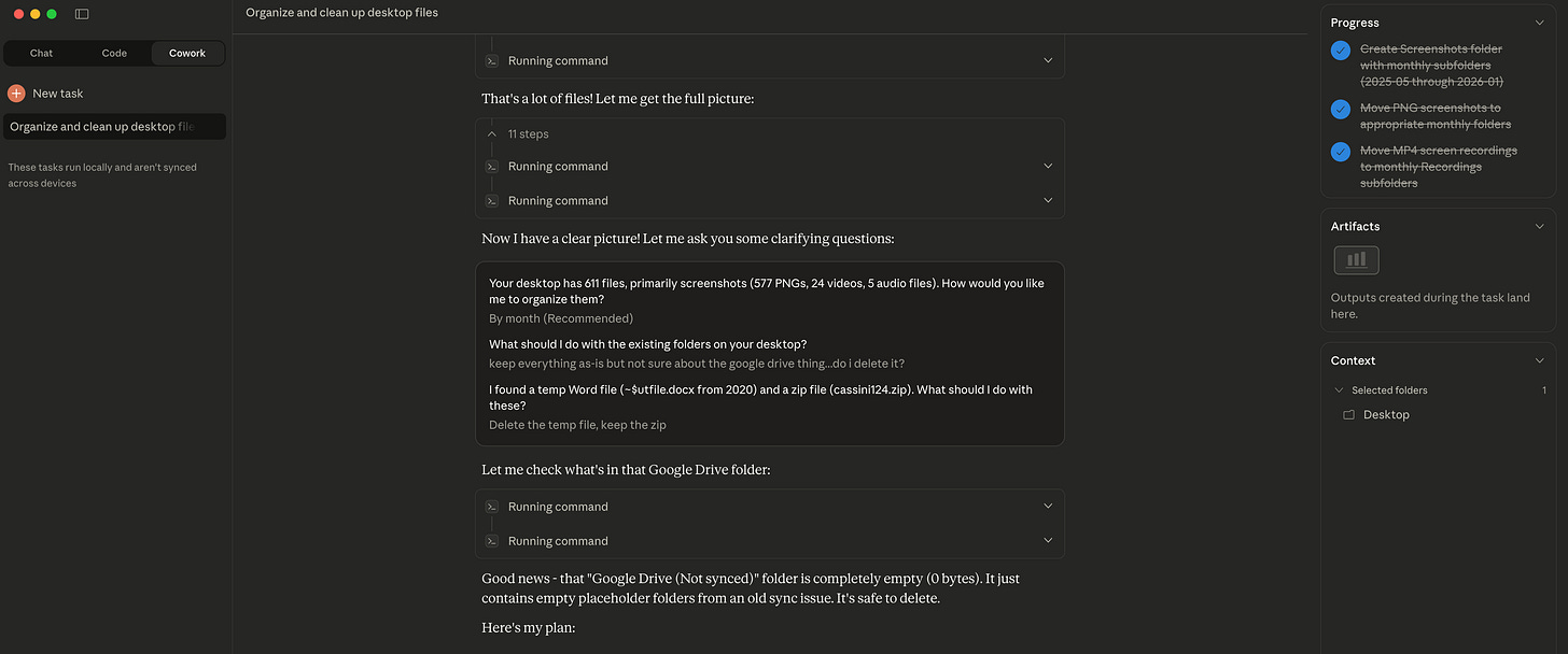 I tried Cowork yesterday. Asked Claude to help organize my desktop, which had accumulated 611 files over the past several months, mostly screenshots. Two minutes later, they were sorted into folders by year and month, organized right there where they lived.