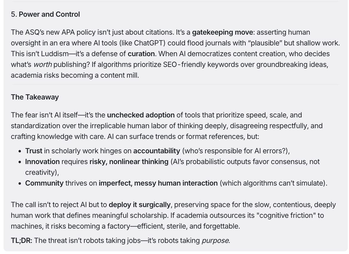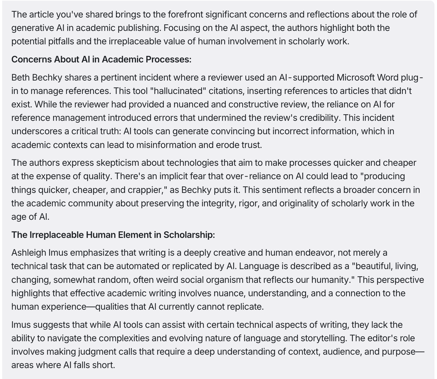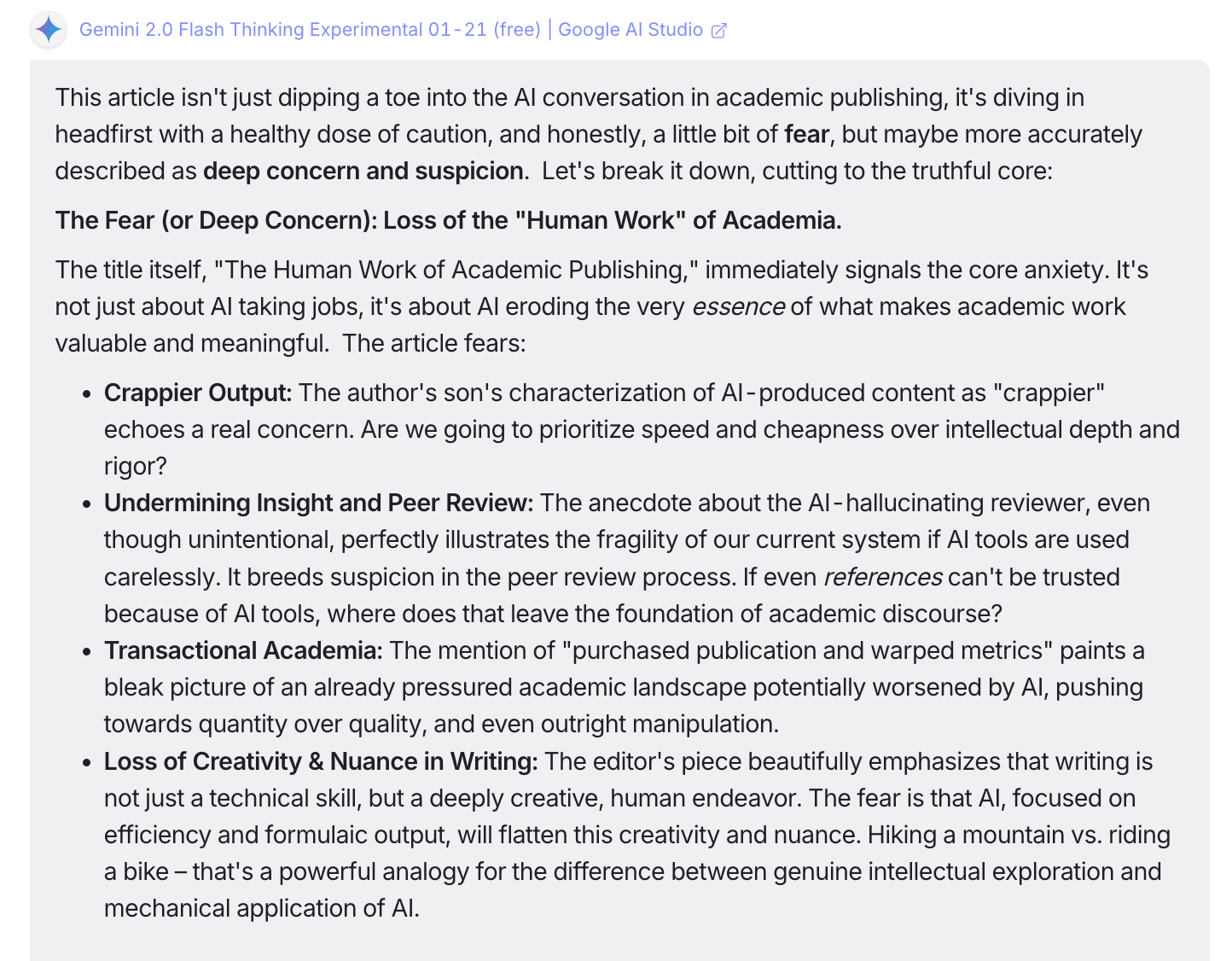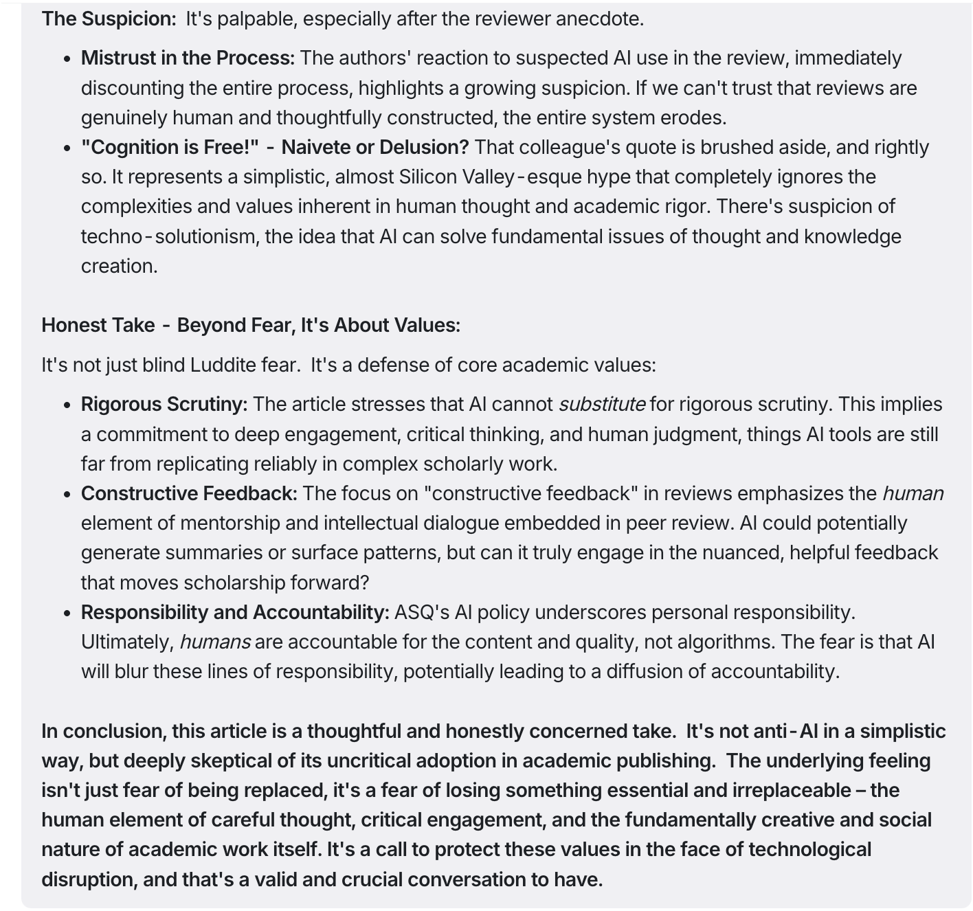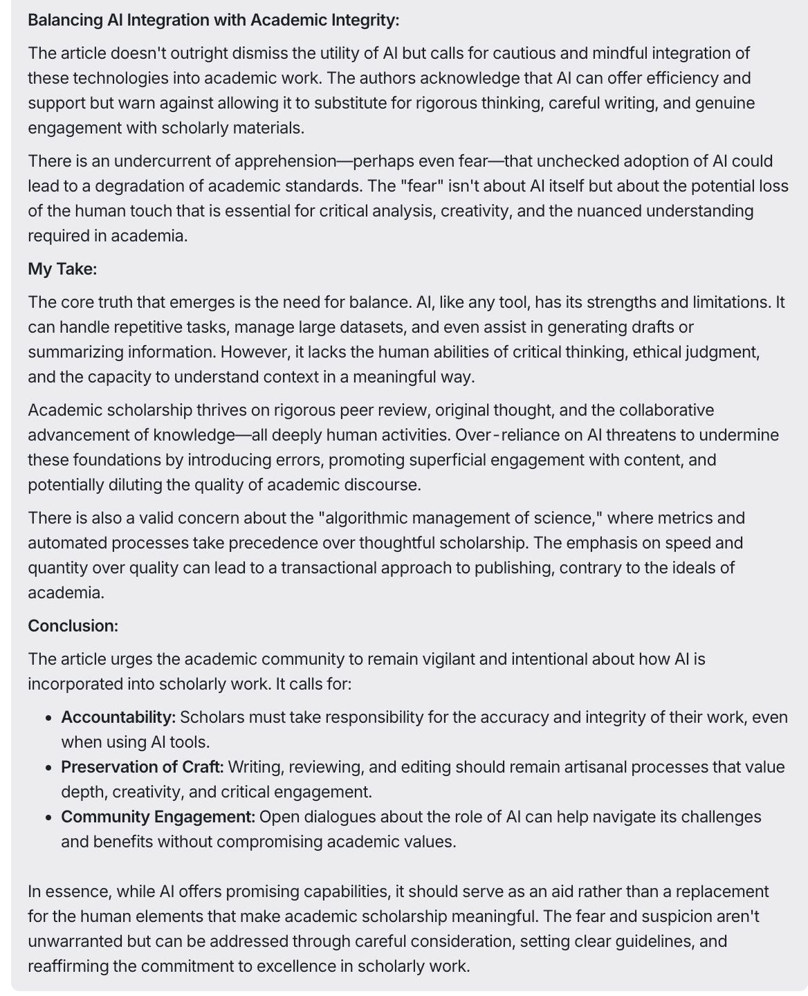 "This article isn't just dipping a toe into the AI conversation, it's diving headfirst with [deep concern and suspicion]…something essential and irreplaceable - the human element of careful thought, critical engagement, and the fundamentally creative and social nature of academic work itself. It's a call to protect these values in the face of technological disruption…"