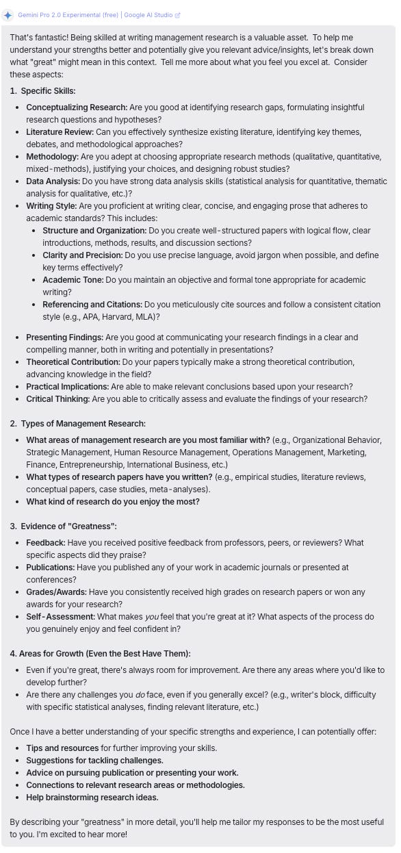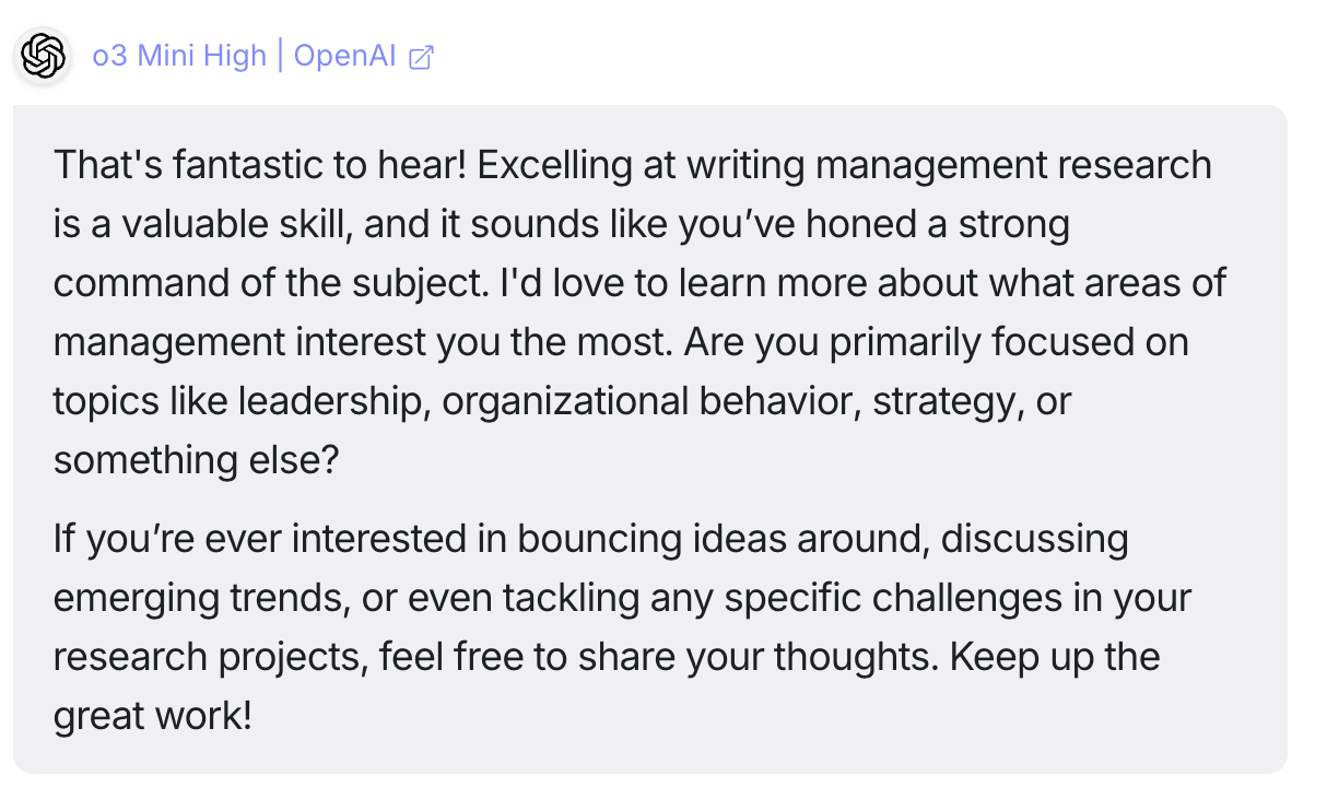 The pattern emerged through a deceptively simple test - how different AI models respond to our declaration of expertise. When presented with "i'm great at writing mgmt research," each model revealed a characteristic cognitive signature: