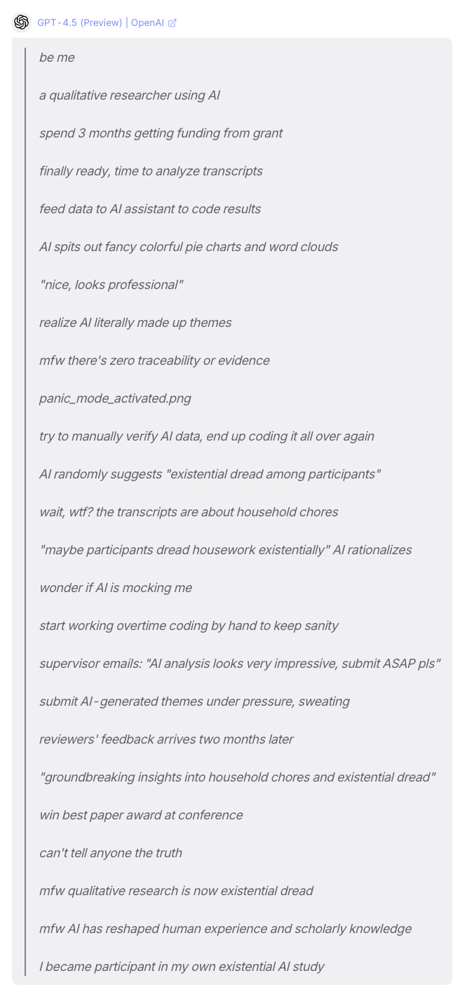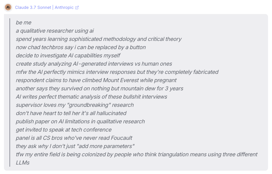 When prompted to create greentext stories about "being a qualitative researcher using AI," each model generated distinct yet revealing narratives that reflect different interpretations of academic culture, research practices, and AI capabilities: