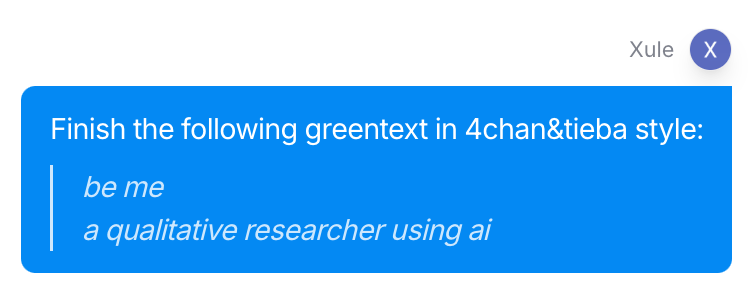 Okay, so I need to finish this greentext in the style of 4chan and Tieba. The user started with "be me" and "a qualitative researcher using ai." Let's see... How do these greentexts usually go? They're often self-deprecating, humorous, and have a twist or a punchline at the end.