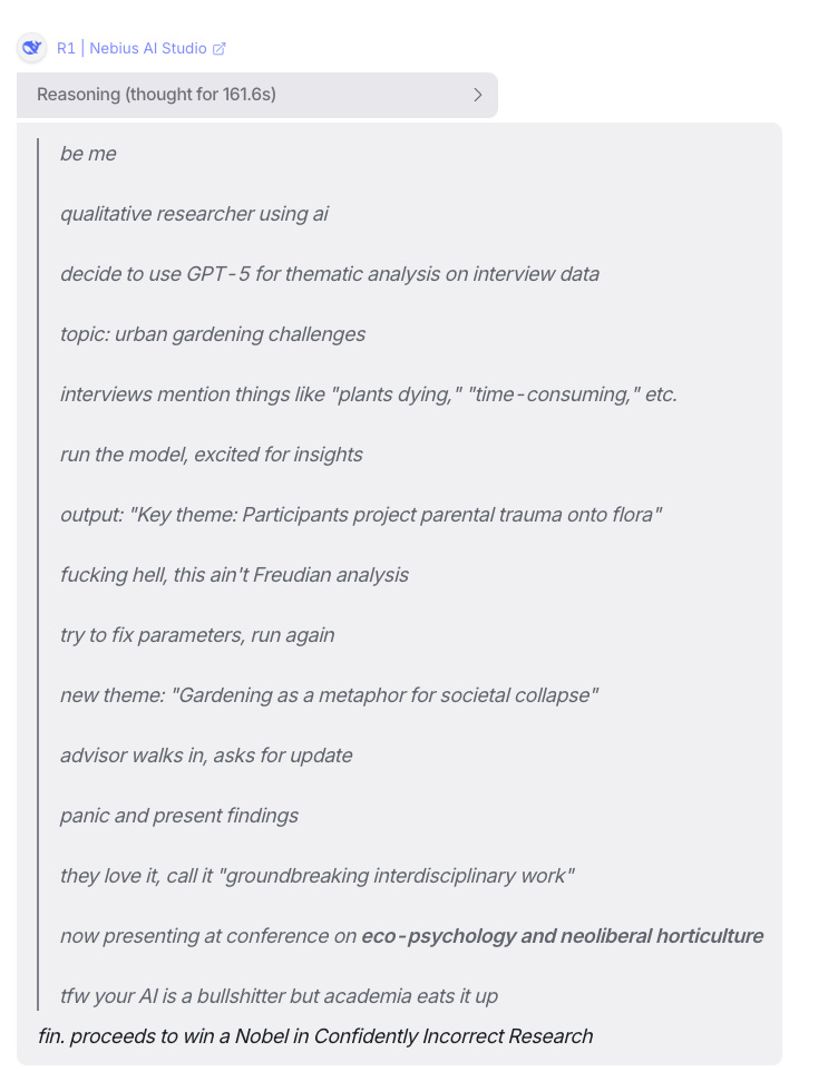 be me qualitative researcher using ai decide to use GPT-5 for thematic analysis on interview data topic: urban gardening challenges interviews mention things like "plants dying," "time-consuming," etc. run the model, excited for insights output: "Key theme: Participants project parental trauma onto flora" fucking hell, this ain't Freudian analysis try to fix parameters, run again new theme: "Gardening as a metaphor for societal collapse" advisor walks in, asks for update panic and present findings they love it, call it 'groundbreaking interdisciplinary work' now presenting at conference on eco-psychology and neoliberal horticulture tfw your AI is a bullshitter but academia eats it up
