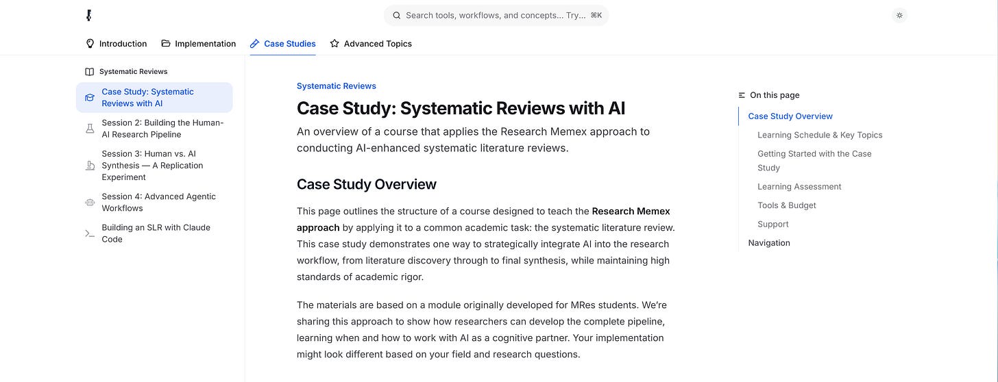 Educators will find: The 4-session systematic reviews course fully documented. But Research Memex offers more: principles, extensive tool setup guides across the whole research stack, cognitive blueprints, failure documentation that work across disciplines. The Replication Experiment translates to any methods course. Interpretive Orchestration applies wherever students learn to work with AI in research.