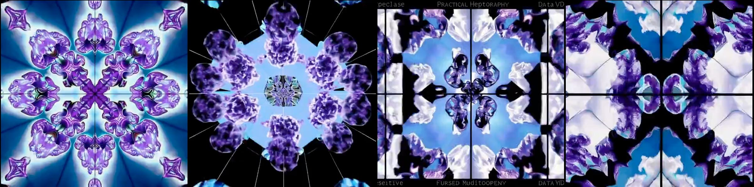 FRAME 1 (0:00-3:00): Extreme close-up of crystalline structures that appear microscopic but gradually reveal themselves to be massive. Camera pulls back to show these forms are actually letters from different alphabets, constantly morphing between scripts. Shot entirely in ultraviolet ranges, so familiar objects appear alien. Multiple exposure techniques create 7 simultaneous versions of the same space, each with slightly different timing.