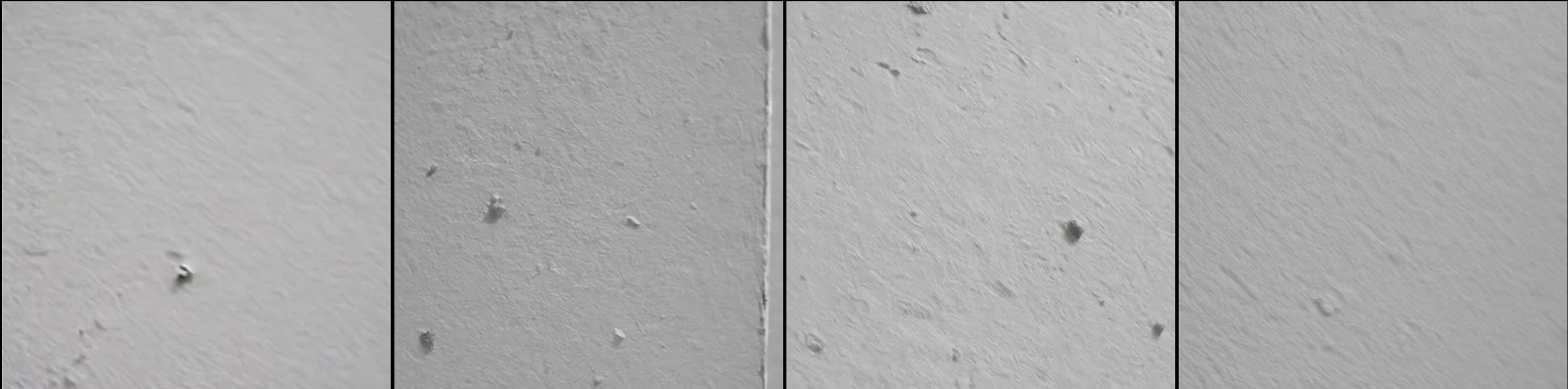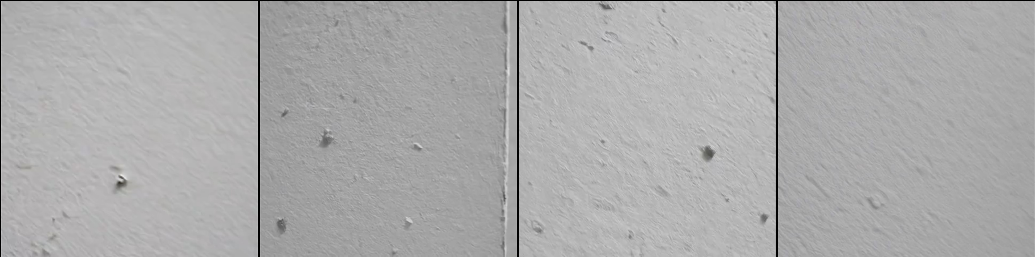 Frame 4 (9-12s): Back to the wall, but now angled slightly so a corner is visible. A single insect—perhaps a small ant—walks in a straight line up the wall. Its movement is steady, unobtrusive.